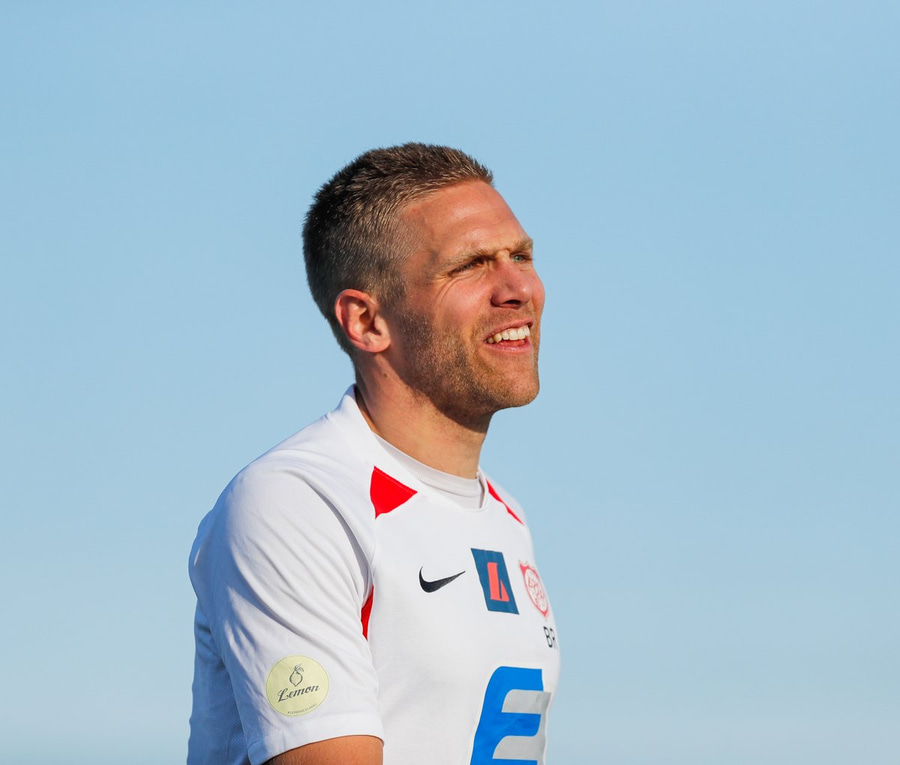 Stoppar Hauka frá því að komast í skyndisókn eftir aukaspyrnuna.