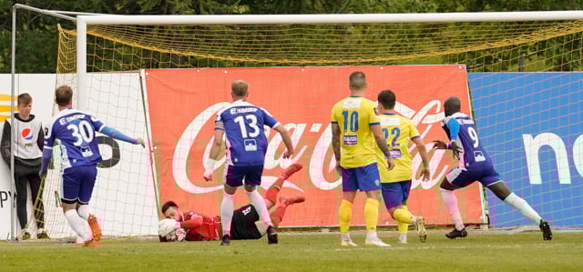 Hér skorar Nkoui eftir frábæra fyrirgjöf frá Alexander Veigari en hann er flaggaður rangstæður.