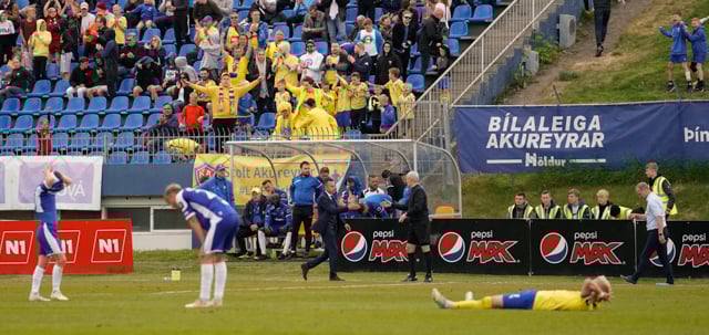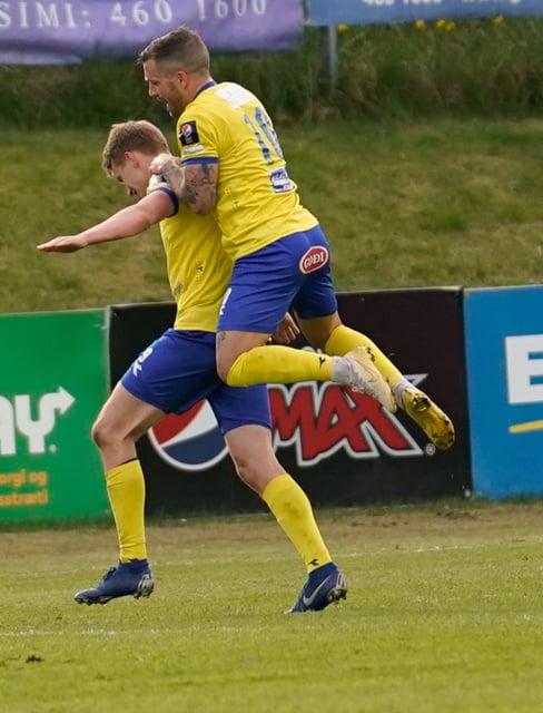 Þá flautar Pétur dómari til leiksloka og 2-1 sigur KA staðreynd.