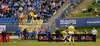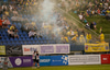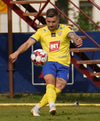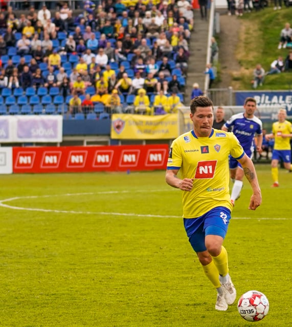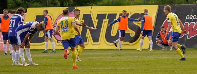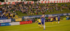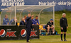 Grímsi tekur aukaspyrnuna með vinstri og er hún beint á Vladan í markinu. Í sömu andrá flautar Pétur til hálfleiks. Heimamenn leiða 1-0.