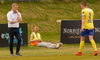 Daníel Hafsteins liggur hér eftir á vellinnum. Rann eitthvað til og virðist finna til í náranum.