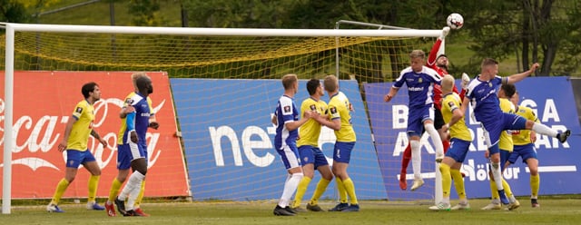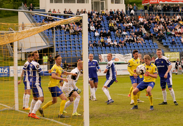Aukaspyrna Hallgríms Mars ratar beint á kollinn á nafna hans Jónasson en boltinn svífur framhjá markinu.