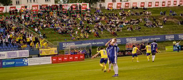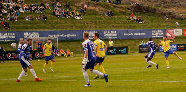 Leikurinn fer fram á Greifavellinum í blíðskapaveðri hér á Akureyri. Bærinn iðar af lífi enda Júbbilering og Bíladagar í fullum gangi.