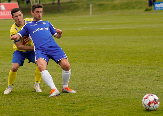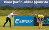 Bjarni Aðalsteins mundar hér skotfótinn fyrir utan teig en boltinn fer beint í hnakkann á Steinþóri Frey.