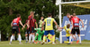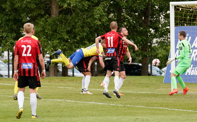 Mátti reyna! Hallgrímur setur boltann út við vítateig á bróður sinn úr hornspyrnunni sem tekur boltann á lofti en nær ekki að hitta boltann vel.