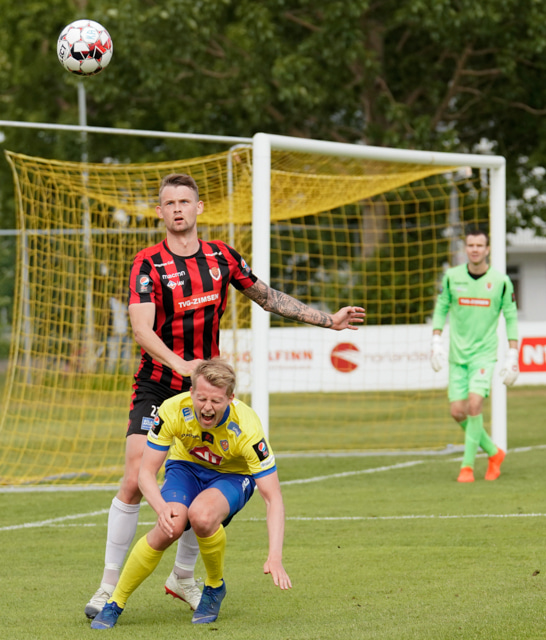 Geggjaður bolti frá Ásgeir inn fyrir vörn Víkinga en Dofri gerir vel í að hindra Elfar Árna í för sinni að boltanum.