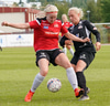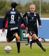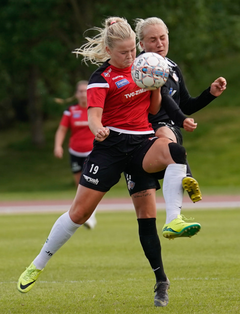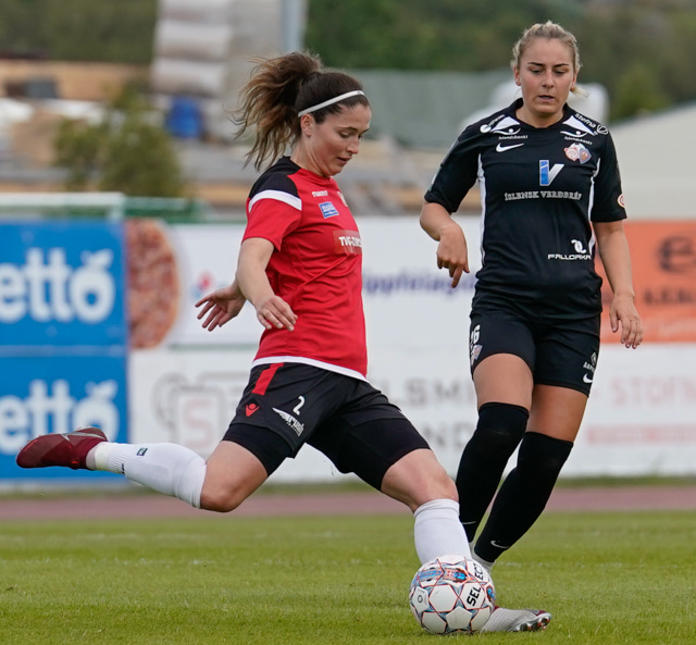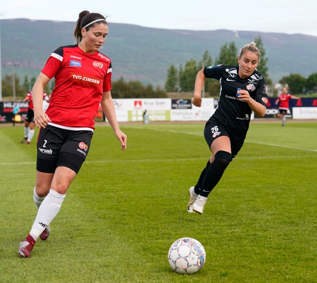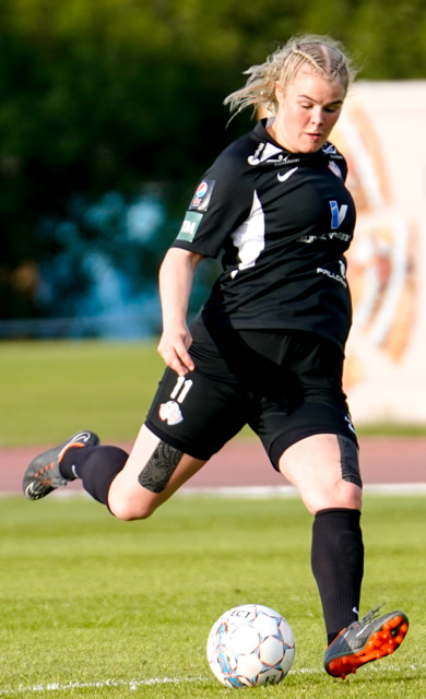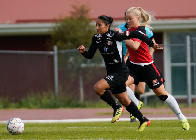 Svahildur búinn að byrja af krafti út á vinstri vængnum hjá HK/Víking, með frábæran bolta fyrir er boltinn skallaður burtu af Örnu Sif.