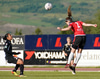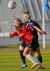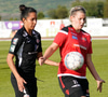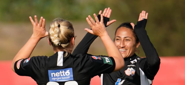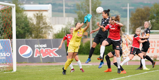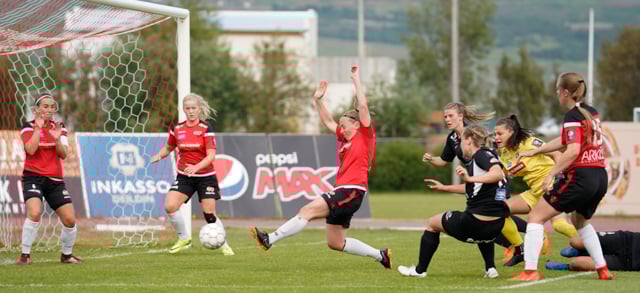 Hárfínt bolti á kollinn á Örnu Sif úr aukaspyrnunni en hún nær ekki að stýra honum á markið.