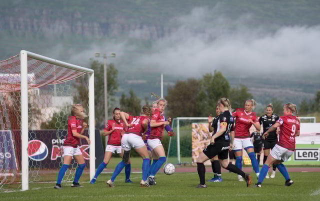 Hornspyrnan hjá Þórdísi er föst og í átt að marki en Hallbera er vel staðsett á línunni og kemur boltanum frá. Þór/KA vinnur boltann hins vegar aftur og endar sóknin með skotinn frá Láru Kristínu sem að Sandra ver.