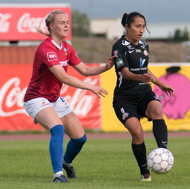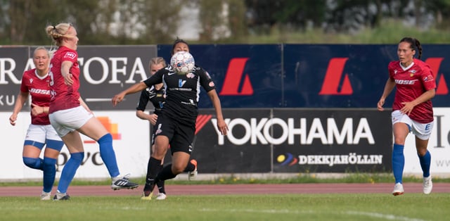 Fanndís með fínan sprett hérna inn af kantinum en skot hennar lengst utan af velli er langt framhjá.