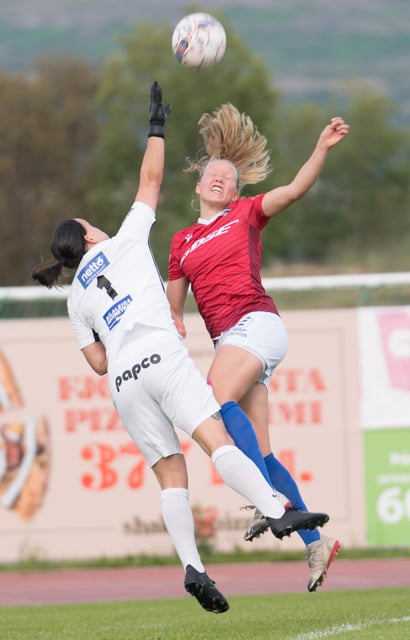 Heiða reynir hér að klippa boltann eftir fyrirgjöf Karenar en hittir boltann illa og hann fer beint í fangið á Söndru í markinu.