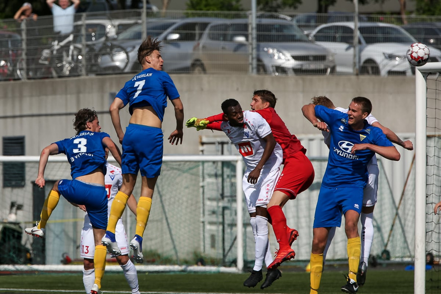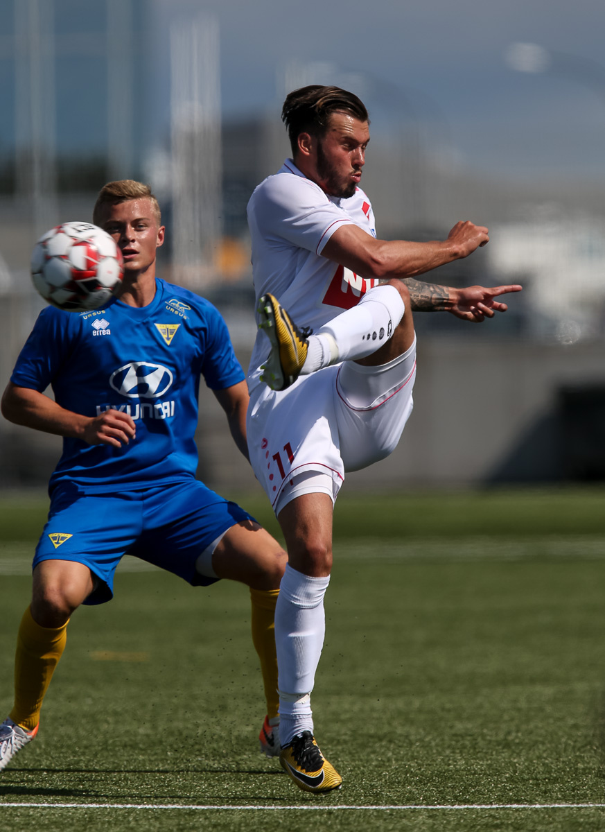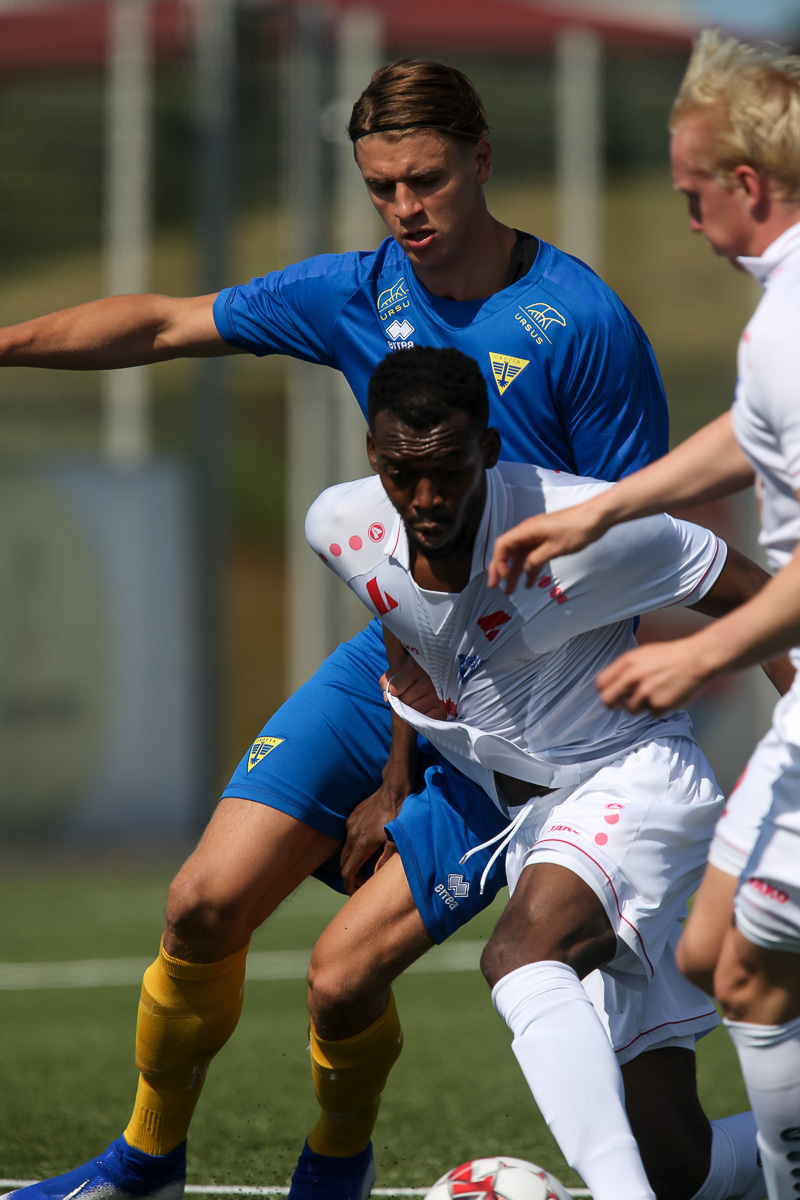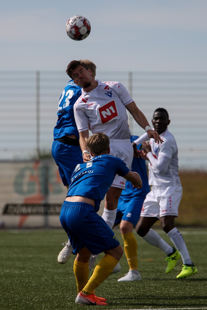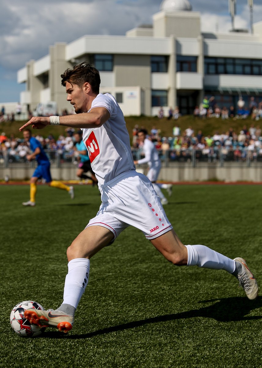 Vidmar Miha kemst upp að endamörkum, leggur hann út í teiginn á Sallieu Capay en Arnar Þór kemst fyrir.