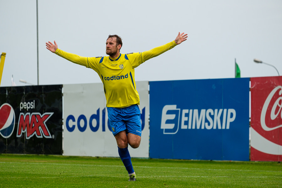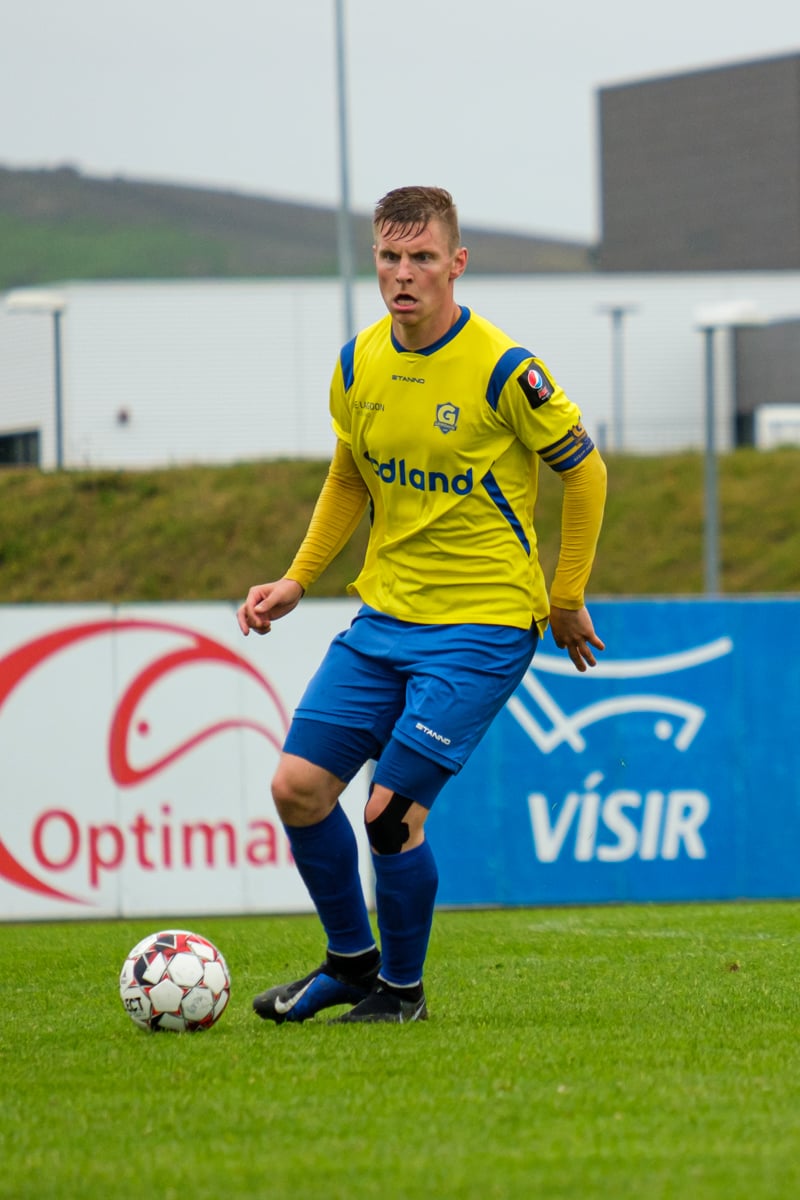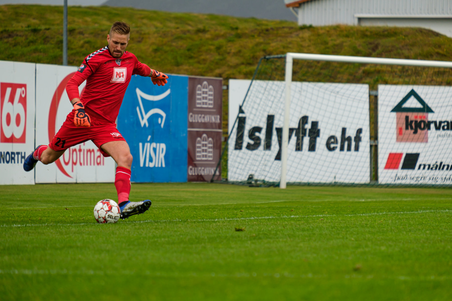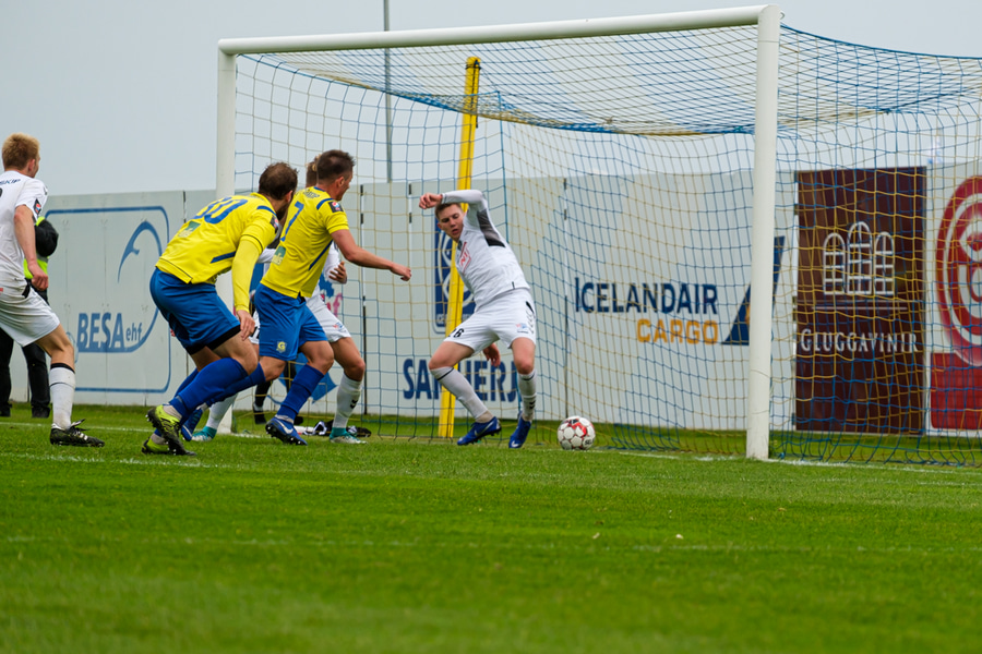 Gunnar Þorsteinsson með skot frá vinstra vítateigshorni sem siglir framhjá stönginni hægra meginn.