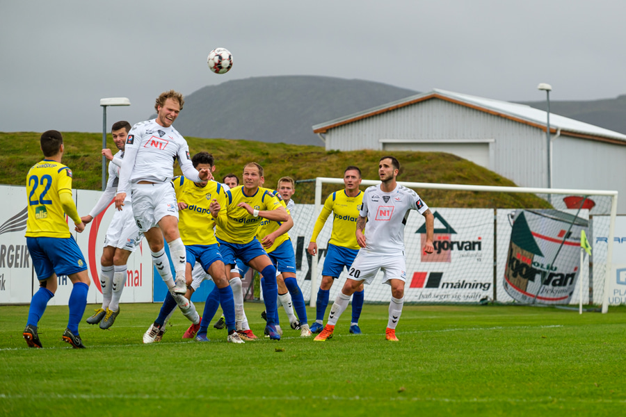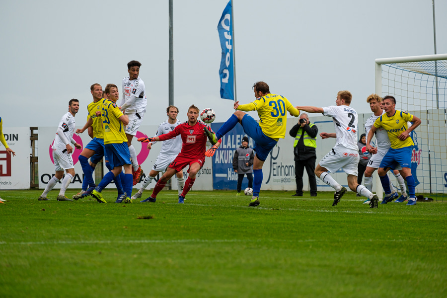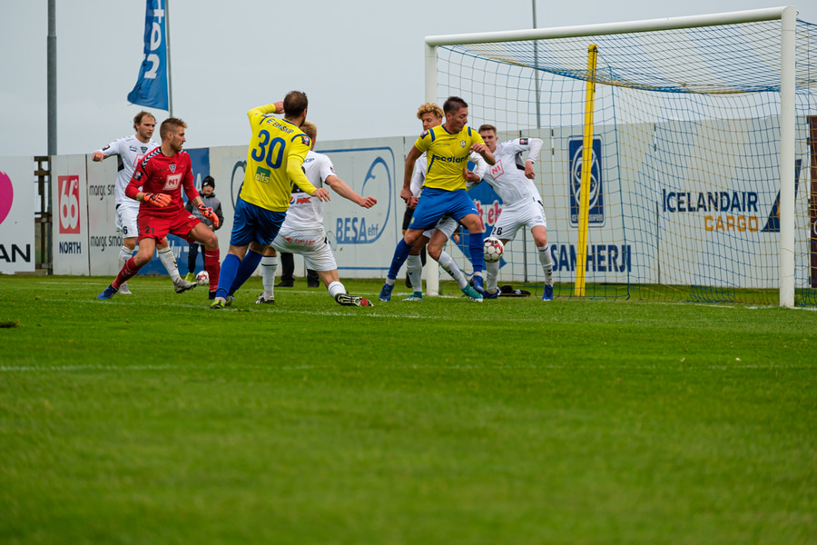 Þrír Grindvíkingar hársbreidd frá því að reka kollinn í boltann sem að endingu siglir þó yfir þá alla og afturfyrir.