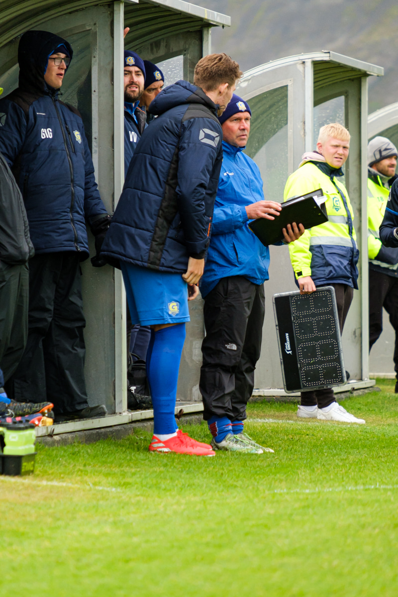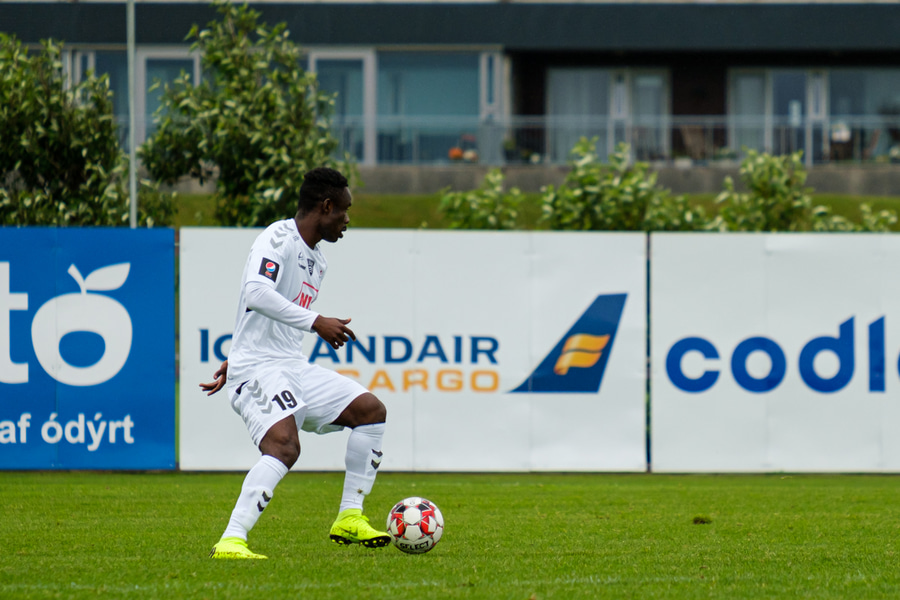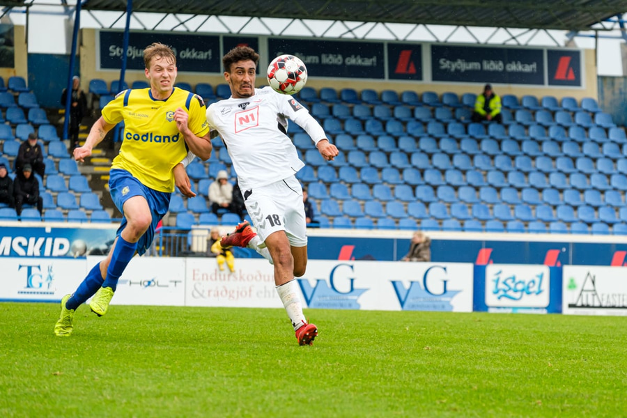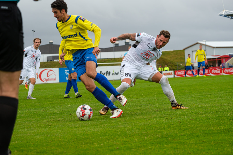 Ruglaðir taktar hjá Diego Diz sem dansar fram hjá hverjum manninum á fætur öðrum, kemur boltanum svo inn á teig á Sigurð sem er hársbreidd frá þ´vi að koma boltanum framhjá Halldóri.