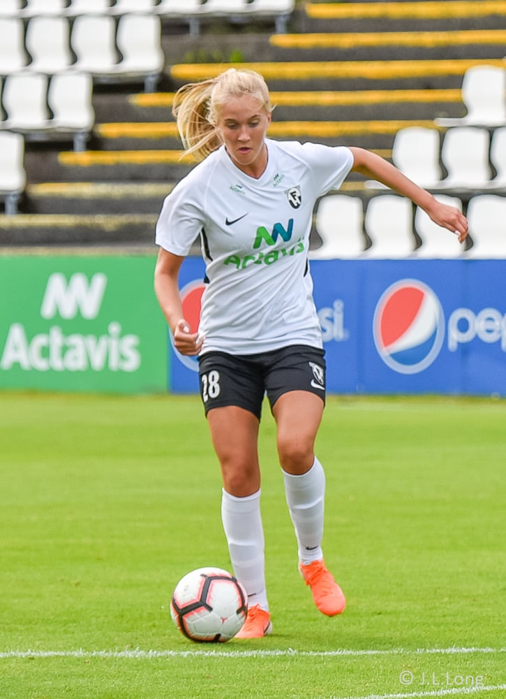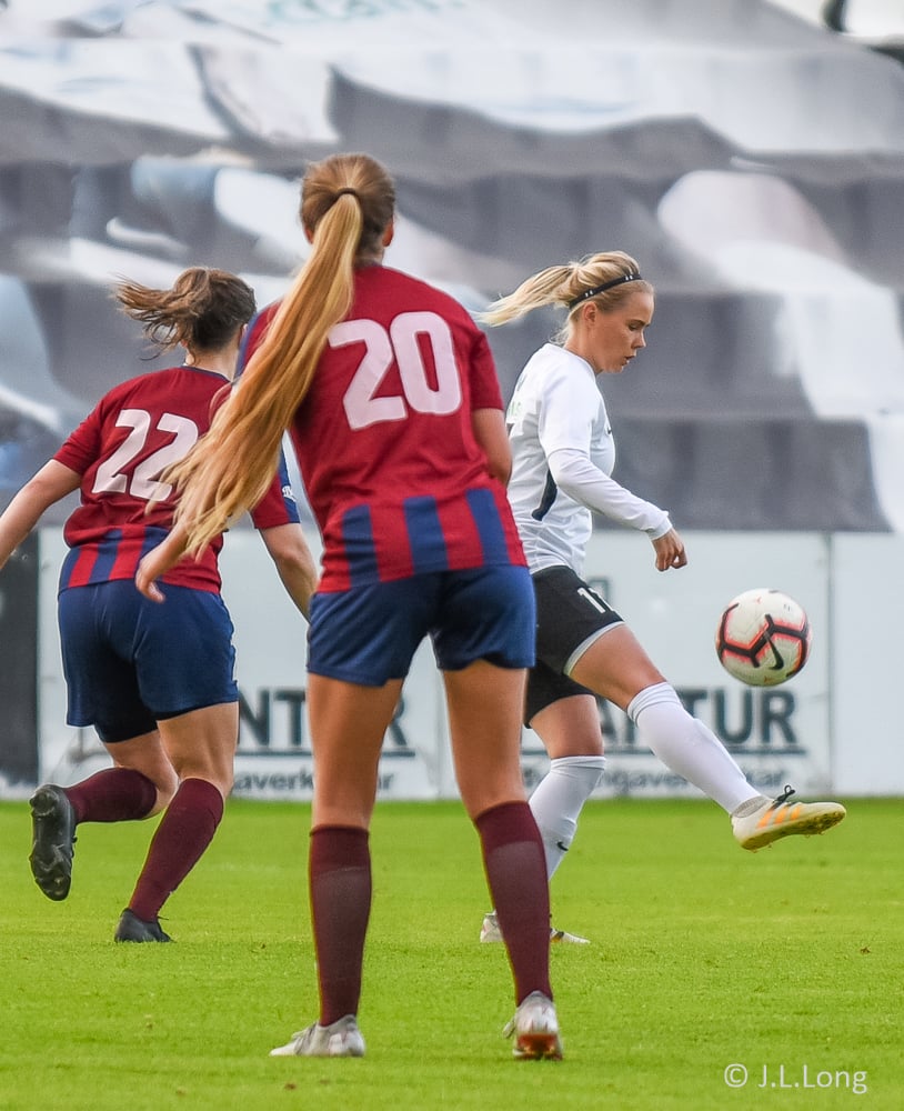 Birta vinnur boltann og kemur honum fyrir markið þar sem Selma og Nótt eru og reyna að teygja sig til boltans en hann er of framarlega.