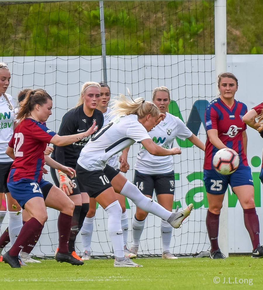 Jacqueline tekur hornspyrnuna og Murielle skallar hann í netið í mikilli þvögu í teignum.