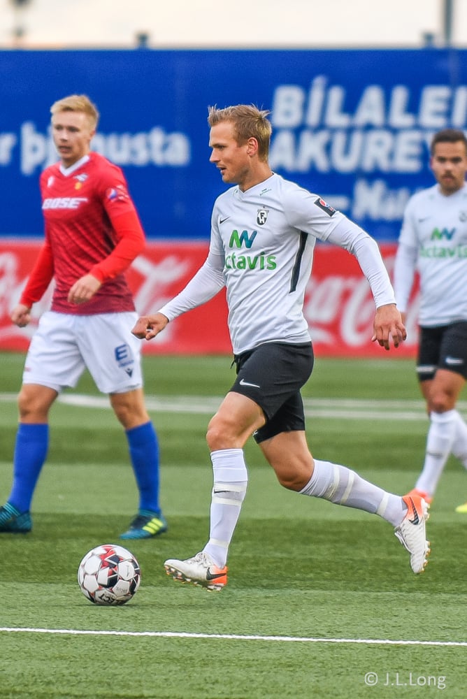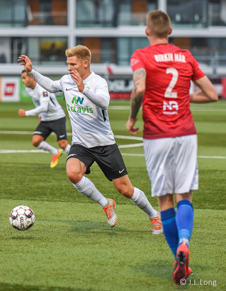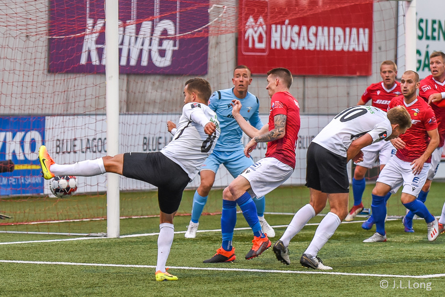 Steven Lennon reynir hér enn eitt skotið eftir góðan undirbúning Jónatans en enn og aftur er skotið yfir markið.