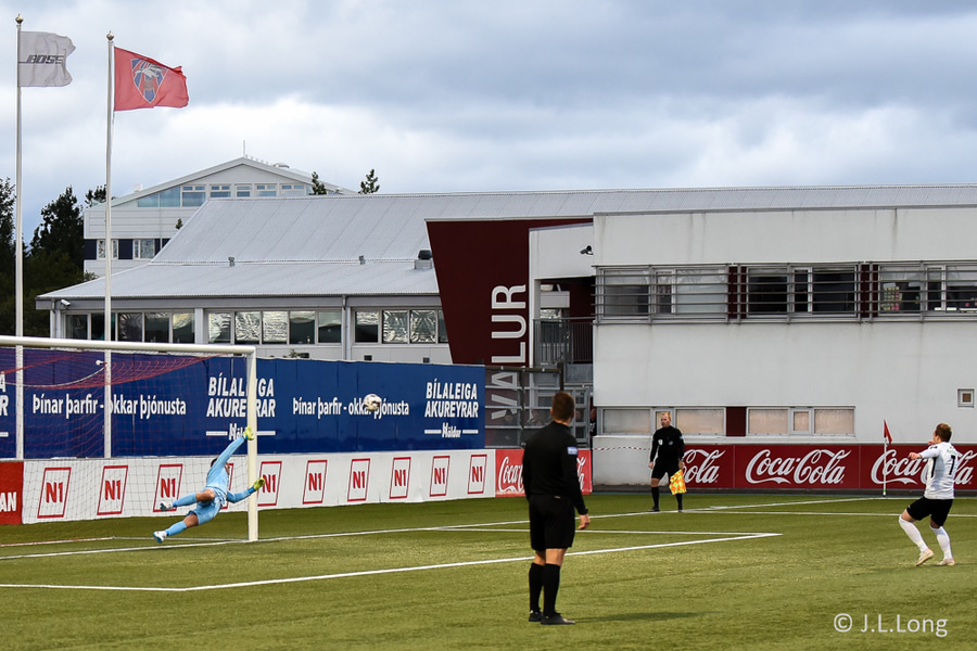 Vindurinn étur hornspyrnu Jónatans sem að verður til þess að boltinn fer rétt yfir markið. Var alls ekki langt frá því að fara inn þarna.