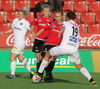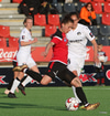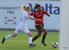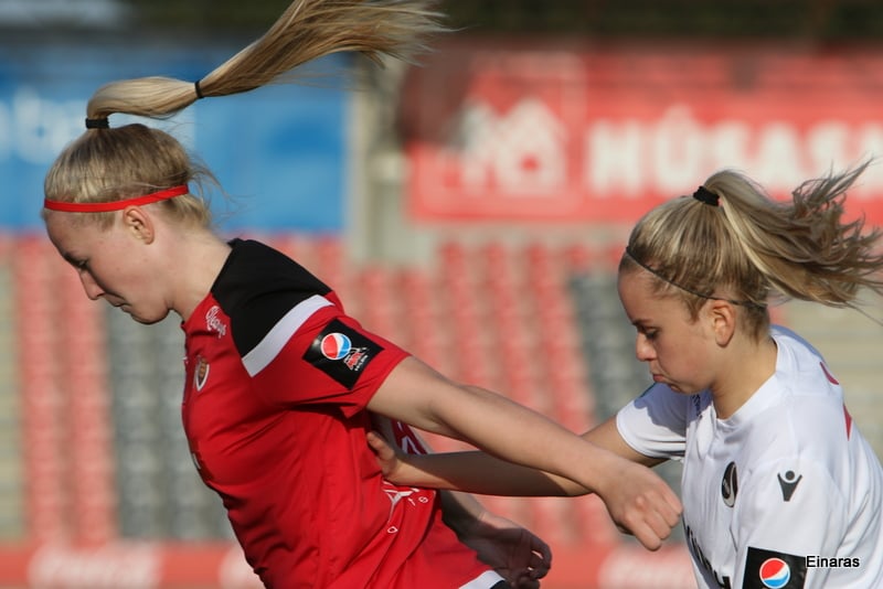 ÞVÍLÍK AFGREIÐSLA HJÁ BRYNDÍSI. Margrét sendir boltann á Bryndísi sem vippar honum snyrtilega yfir Audrey í markinu