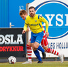 Valgeir fær flugferð. Stígur á boltann og fellur á skondinn hátt upp við endamörk.