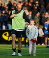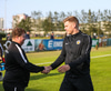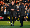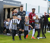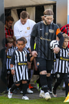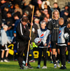 Liðin eru mætt út á völlinn. Afmælisbúningur KR vel svalur, alsvartur með gull-lituð númer á bakinu.