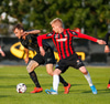 Kristinn Jóns reynir að komast upp vinstra megin en vel gert hjá Júlíusi Magnússyni sem les þetta vel og hirðir knöttinn af honum.