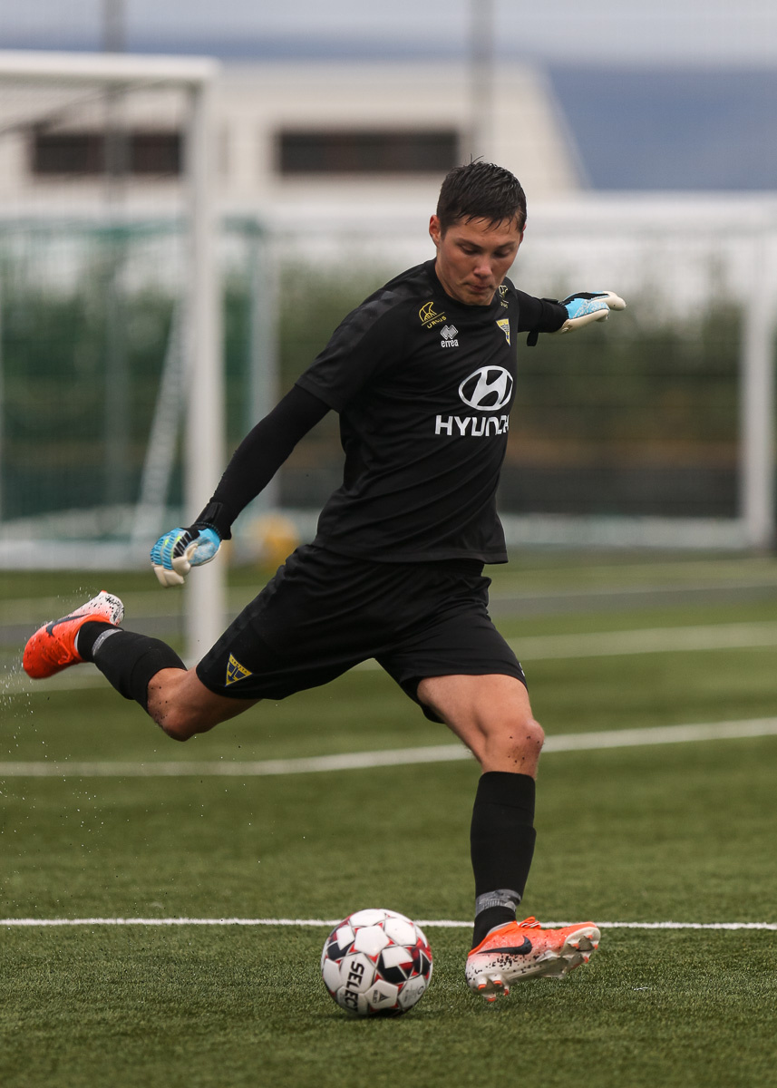 Hákon Rafn í skógarhlaup og Alex Freyr nær skotinu yfir hann en Arnar Þór réttur maður á réttum stað og nær að hreinsa boltann frá markinu.