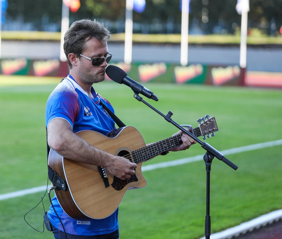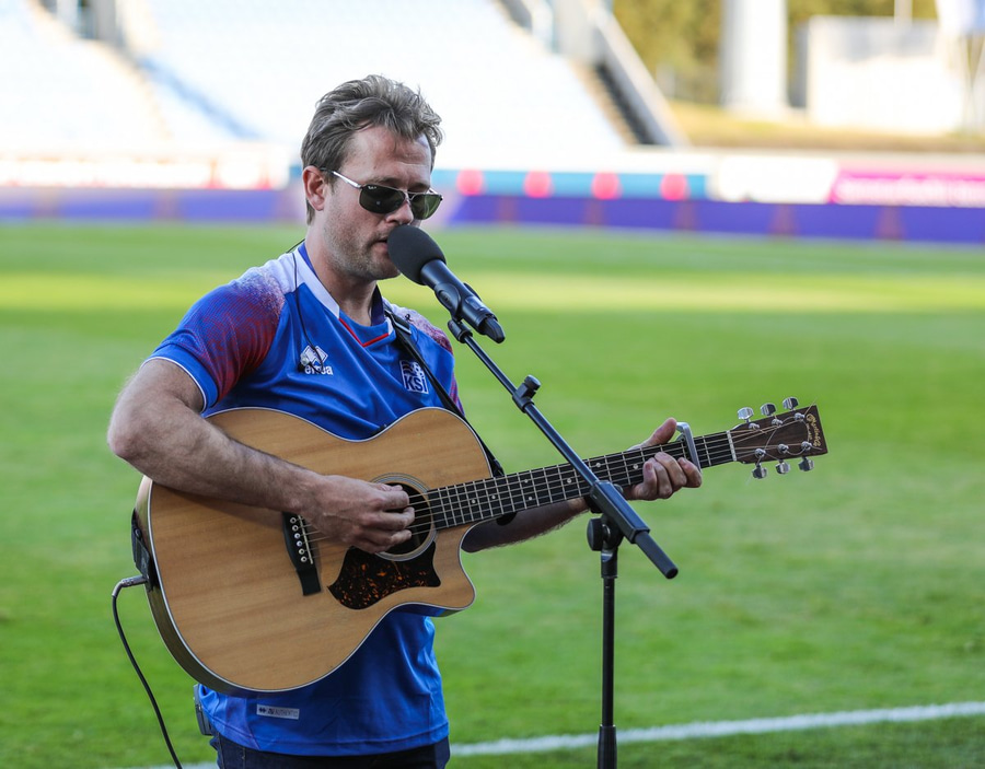 Sjálfur Ingó Veðurguð er mættur til að koma fólkinu í gang og syngja 2 lög. Fyrst tók hann Ísland er land þitt og nú er hann að syngja þjóðsöng íslenska landsliðsins Ég er kominn heim! Virkilega vel gert hjá honum!