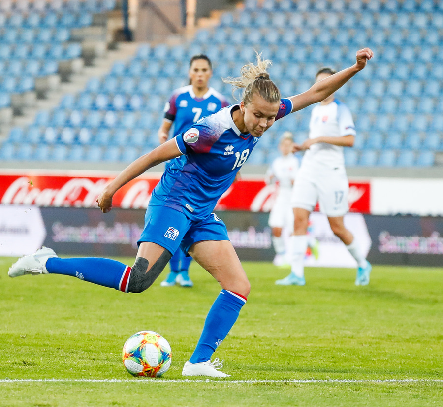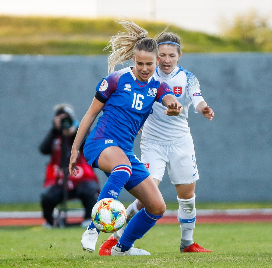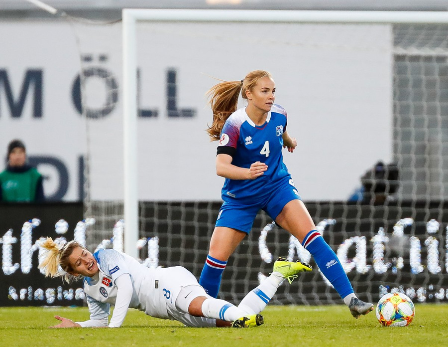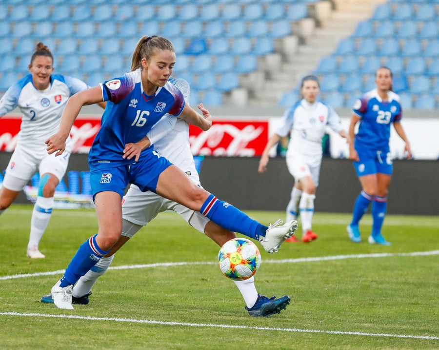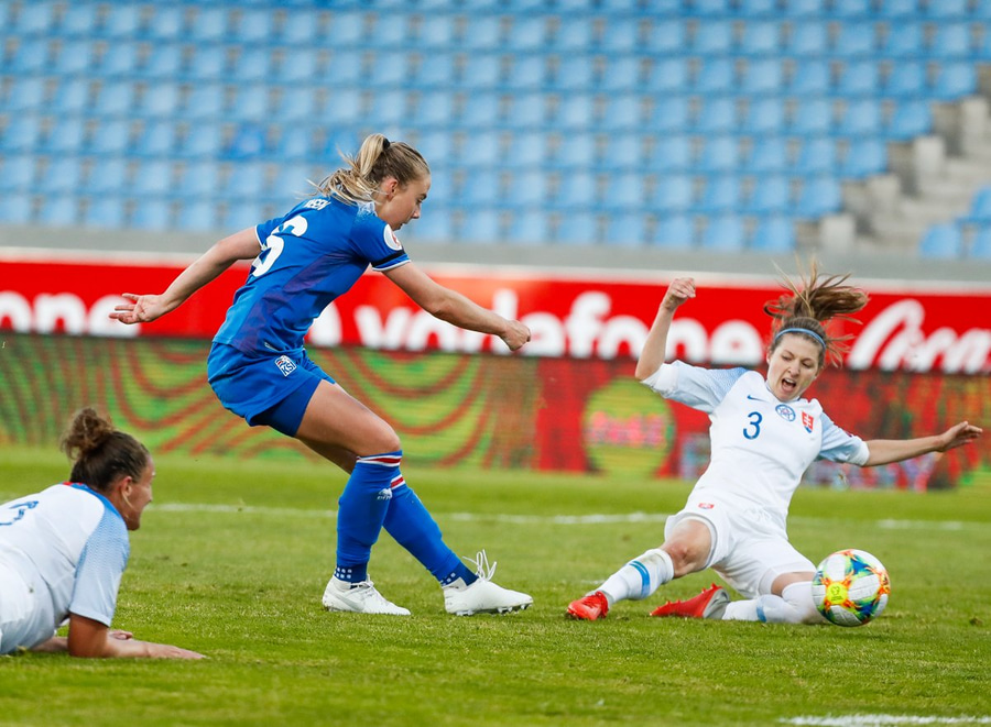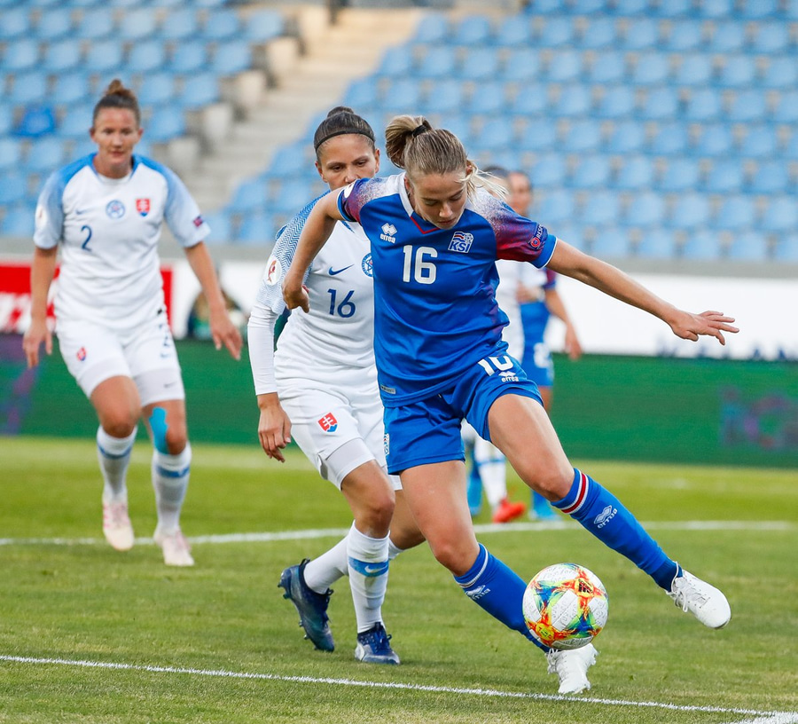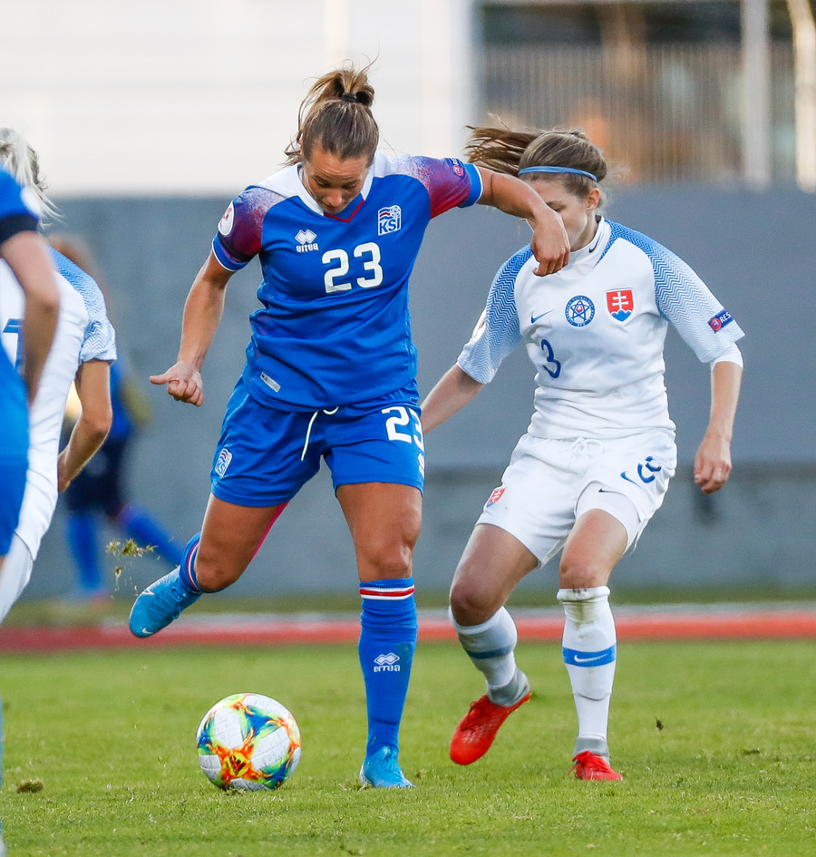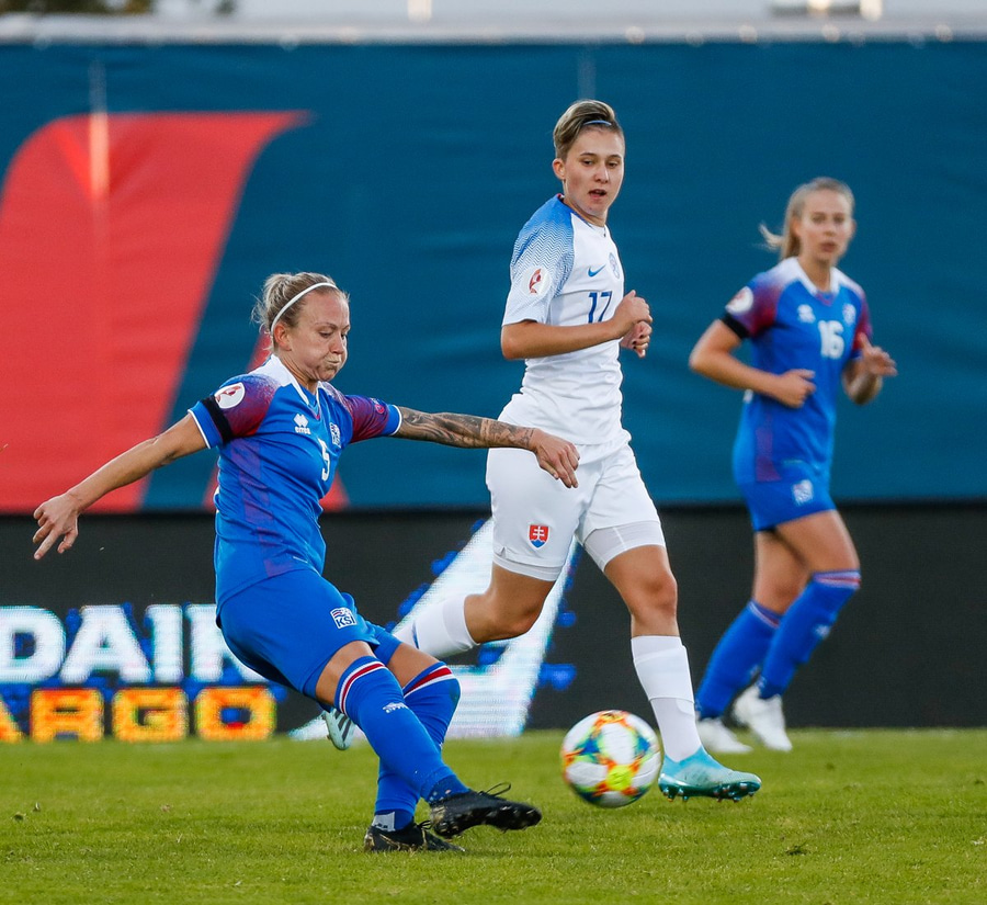 Elín Metta snýr af sér leikmann inn í teig hjá Slóvakíu og finnur Söru sem kemur á fleygiferð inn í teiginn. Varnamaður Slóvakíu kemst hinsvegar á milli Söru og boltans og kemur hættunni frá.
