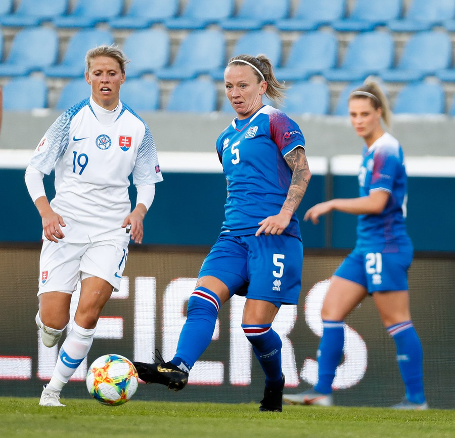 Boltinn fer í átt að hornfána þar sem Sara Björk brýtur af sér og Slóvakía fær aukaspyrnu.