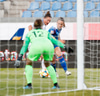 Fanndís með hörkuskot sem Maria Korencioca ver út í teiginn.