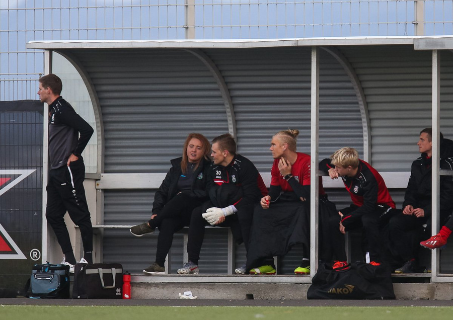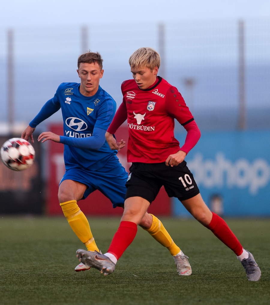 Halldór Kristján í smá veseni nálægt marki Gróttu og Róbert Orri pressar hann hátt. Helgi dæmir brot eftir smá baráttu um boltann.
