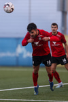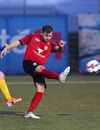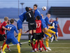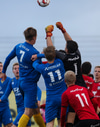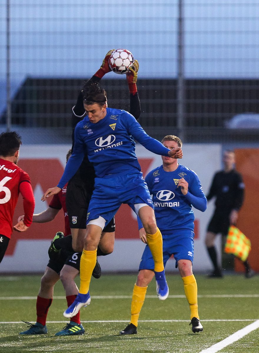 Hættulegur bolti dettur niður fyrir framan Jon í markinu og hann fljótur að stökkva á hann.