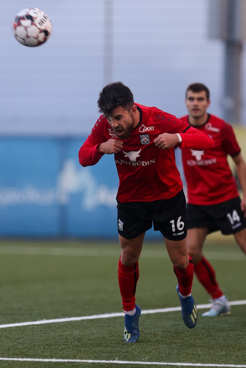 Valtýr Már fær boltann fyrir utan teig gestanna og skýtur á markið en skotið rétt framhjá.