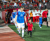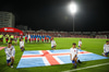 Liðin ganga út á völlinn. Ísland leikur í dag í hvítum buxum og hvítum sokkum.