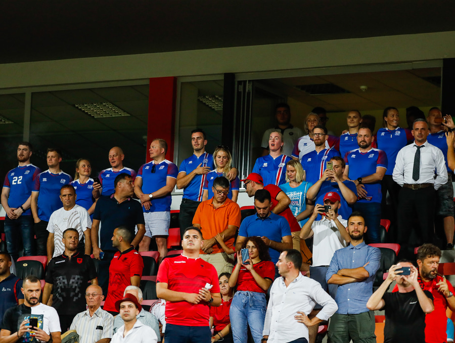 Albanarnir eru í stuði hér fyrir leik, vallarþulurinn þá sérstaklega. Hann er búinn að vera að æfa sig síðustu mínúturnar, hann ætlar að vera með allt á hreinu í kvöld.