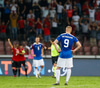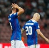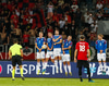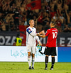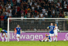 ODISE ROSHI að skora fyrsta mark sitt í undankeppninni. Kom löng sending út vinstra megin á Roshi sem leitaði hægra megin í teiginn, fór framhjá Hirti, þrumaði á markið, boltann hrökk af Kára og fór í netið. Skelfilegt!!