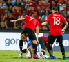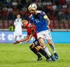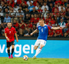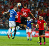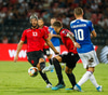 Löngu innköst Arons ekki að virka hingað til. Þrjú innköst og í öll skiptin hafa Albanir verið fyrstir í boltann.