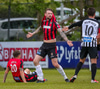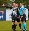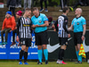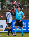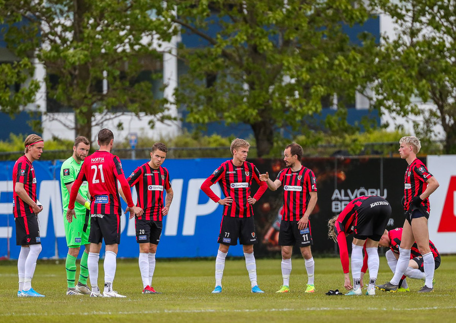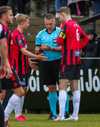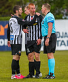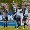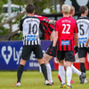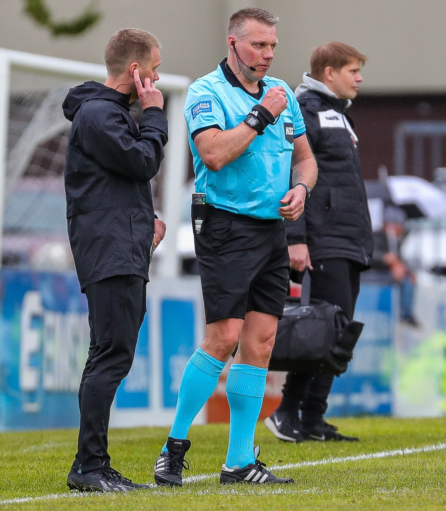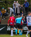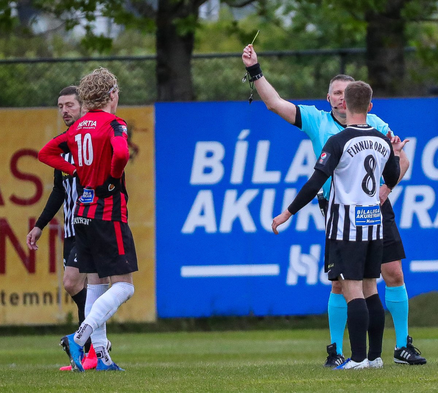 Kristinn og Júlli lenda saman, Júlli rennir sér í boltann. Í kjölfarið hópast menn í rifrildi. Kallað eftir rauðu.