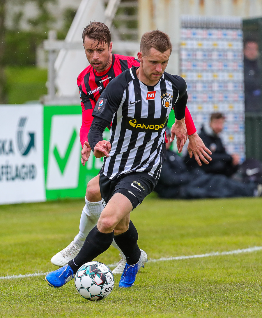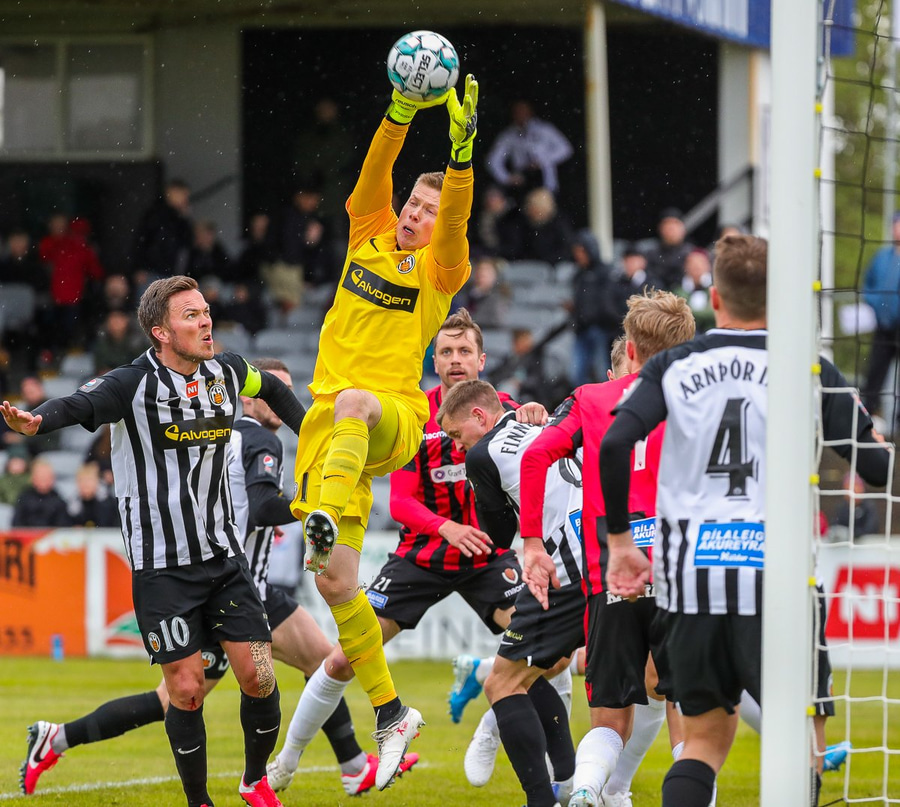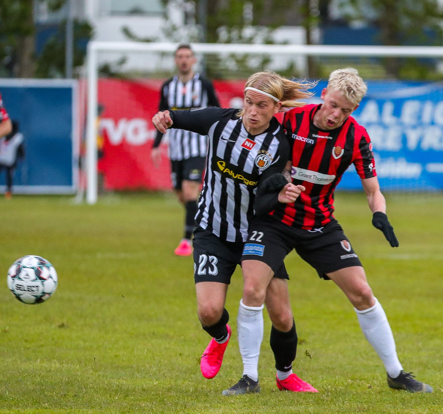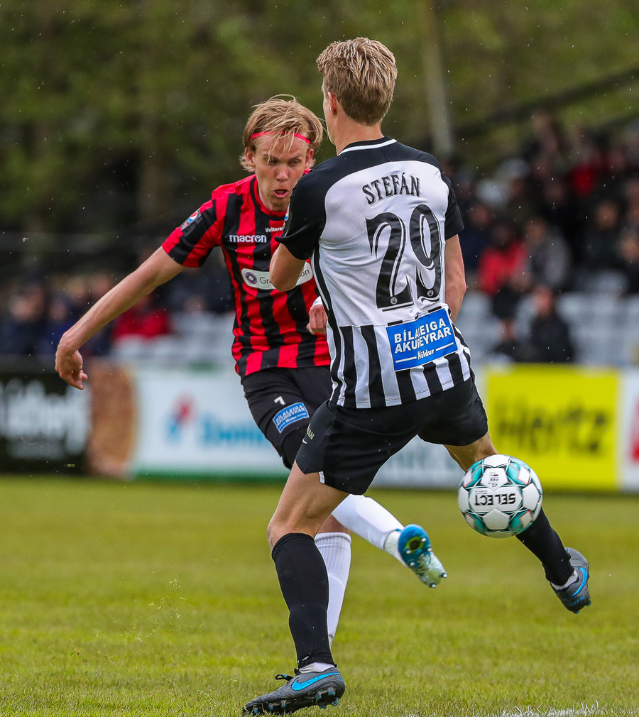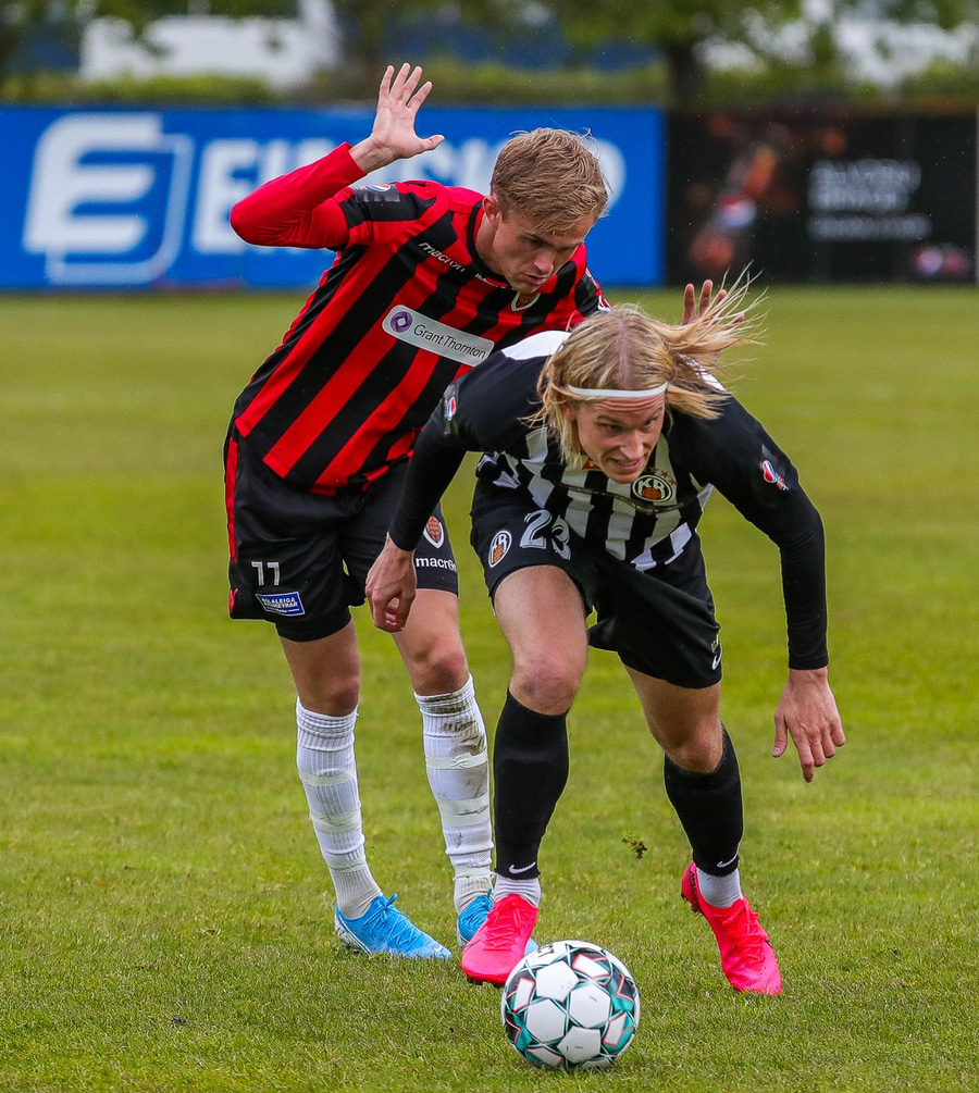 Ingvar aftur í smá brasi í návígi. Boltinn skoppar í kjölfarið á sendingu eftir hornið. Finnur Tómas eltir og er á undan Ingvari sem nær að hlaupa til baka og grípa boltann áður en Finnur náði honum aftur.
