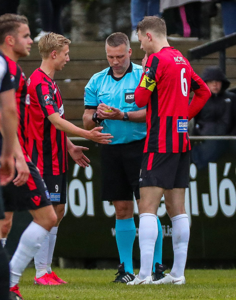 Júlli fær gult spjald fyrir tæklinguna og hinir fyrir framhaldið.