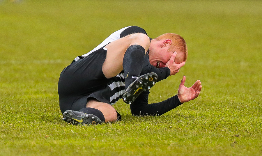 Leikur stöðvaður, Aron liggur eftir og heldur sér um höfuð.
