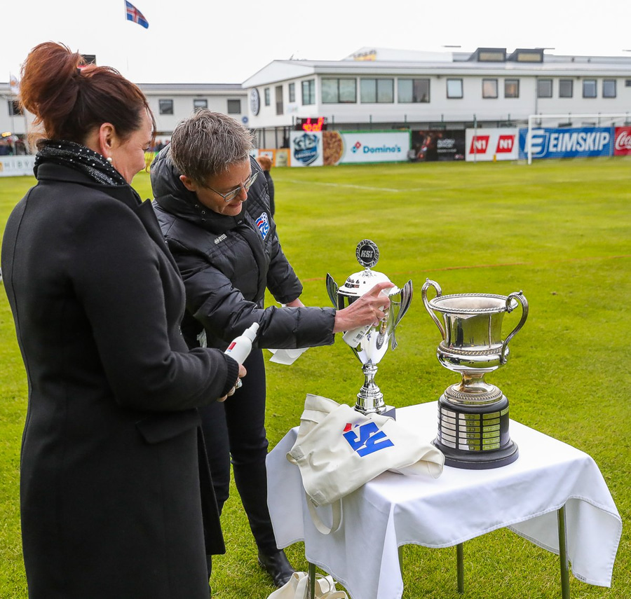 Maggi Gylfa og Guðni Bergs mættir með kaffi í stúkuna. Engar veitingar leyfðar í blaðamannastúkunni.