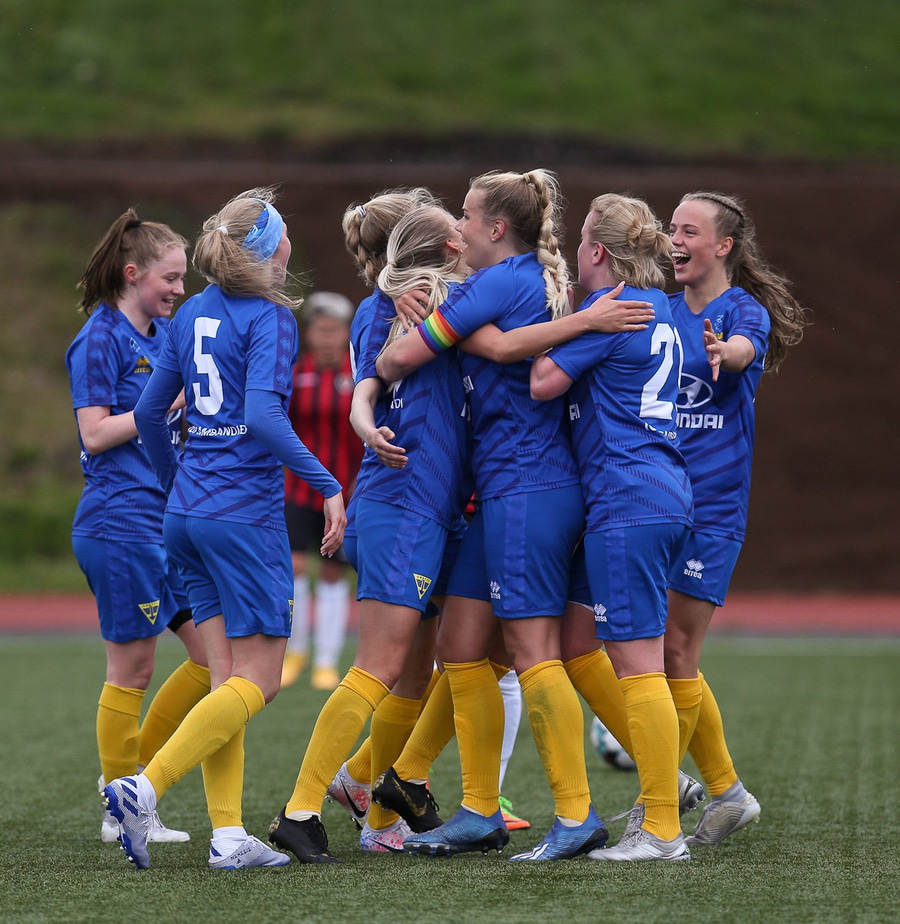 Mér sýndist að Brynhildur skaut í stöngina. Nadía nær frákastinu og gefur hann aftur á Brynhildi sem kemur boltanum í markið.