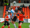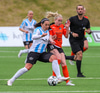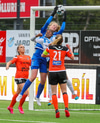 Bryndís kemst þá í fína stöðu. Með Sólveigu og Þórdísi með sér gegn tveimur varnarmönnum en nær ekki að skvera boltann fyrir hlaupið hjá samherja því Kaylan kemur vel út úr markinu og hreinsar.