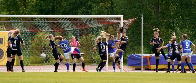 Sædís með flotta spyrnu sem fer einhvern veginn í gegnum allan pakkann og út af hinu megin við markið.