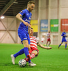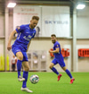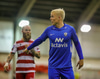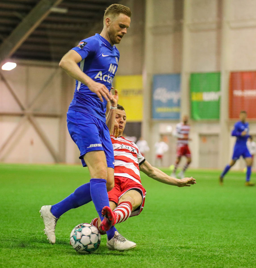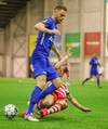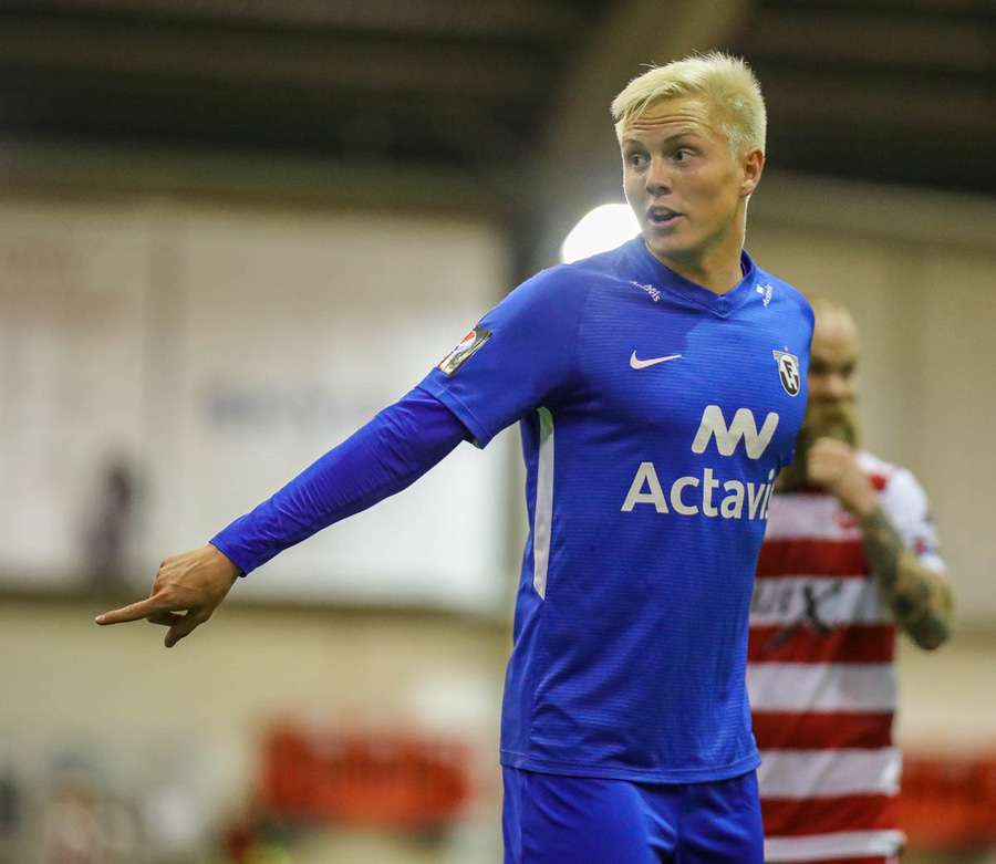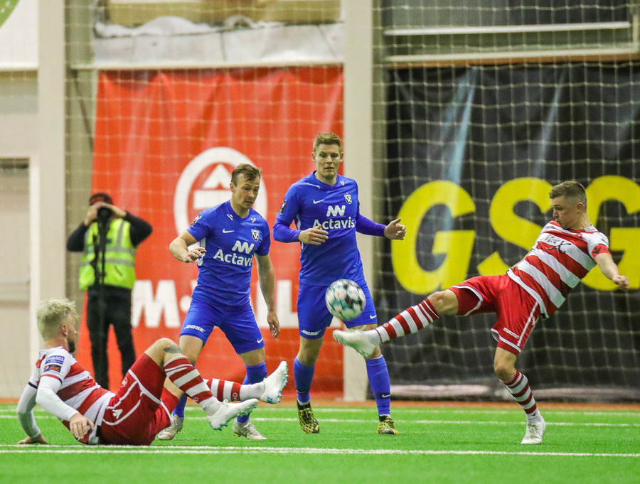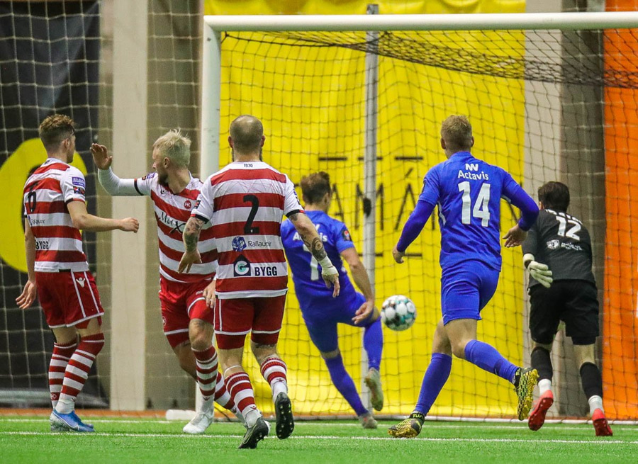 Atli Guðna með sendingu inn fyrir og Lennon stingur sér fram fyrir Alexander Frey og leggur hann með hægri í fjær...