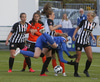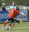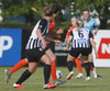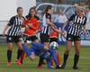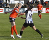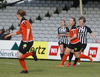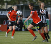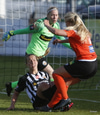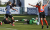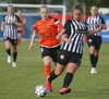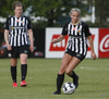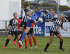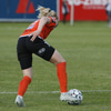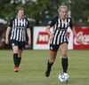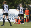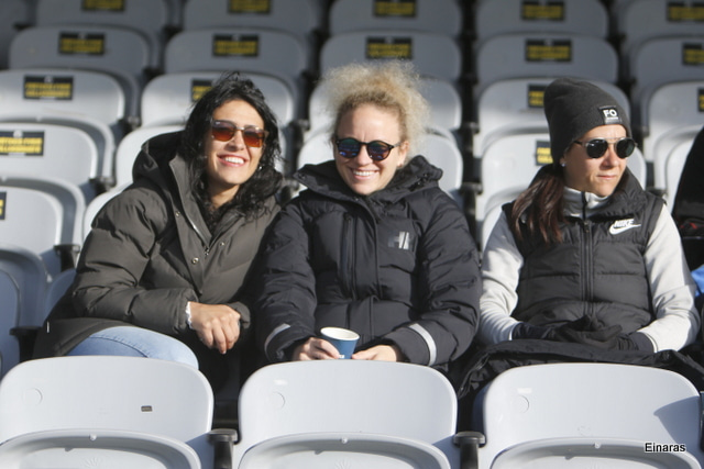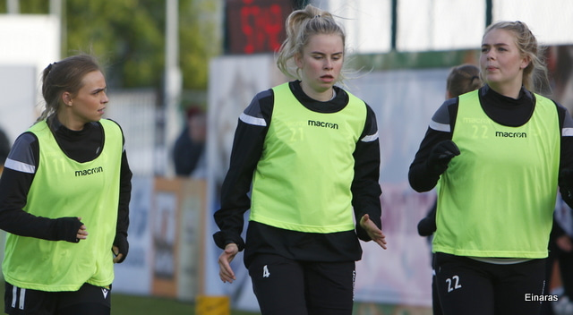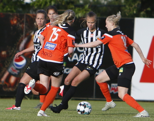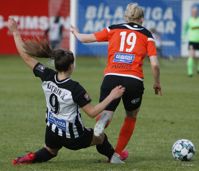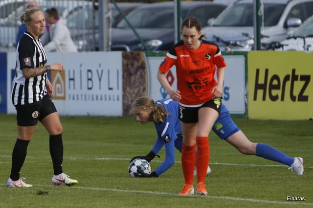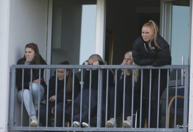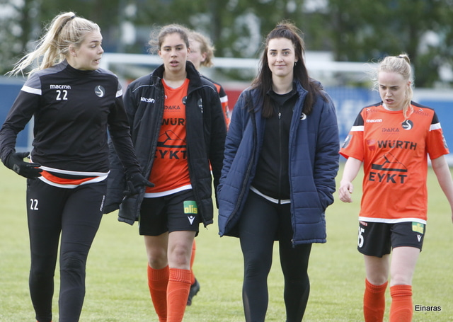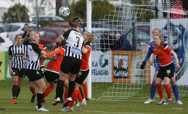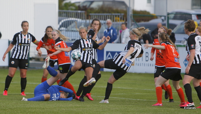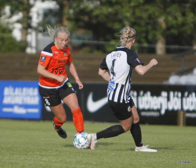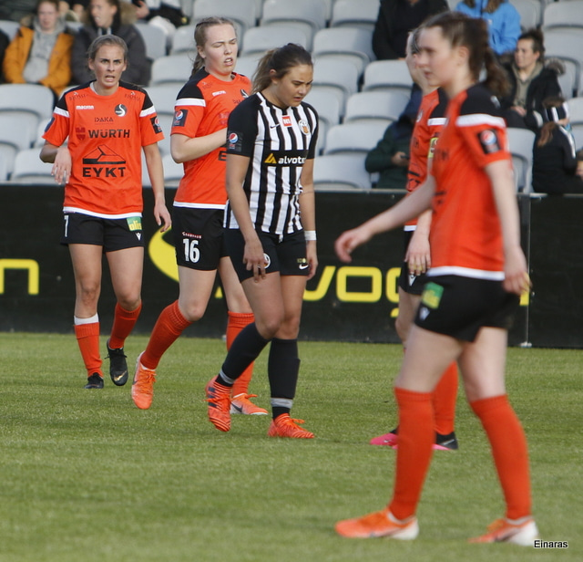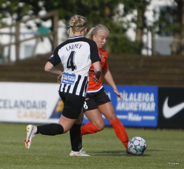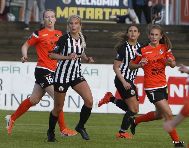 Hulda Hrund gerir vel og nær boltanum á miðjunni. Hún og Bryndís Arna eru tvær á móti Ingunni og Laufey. Hulda Hrund gefur boltann á Bryndísi sem að nær skoti að marki en Ingibjörg ver.