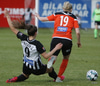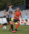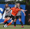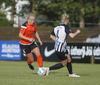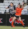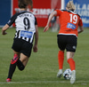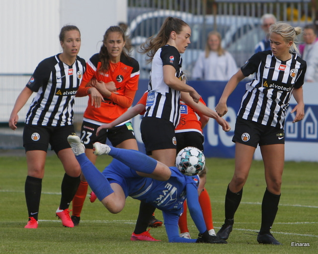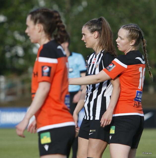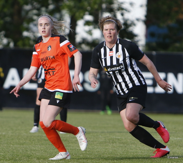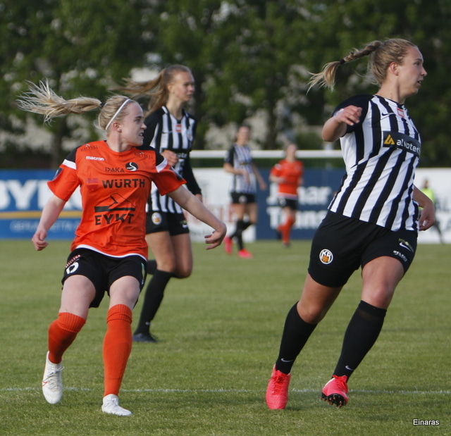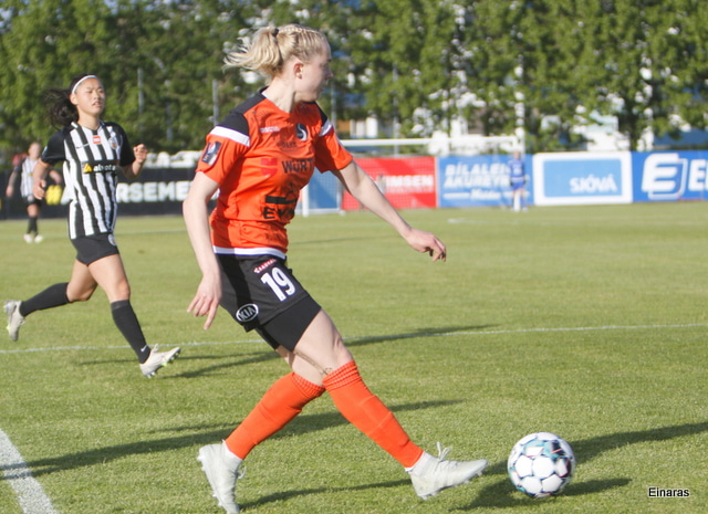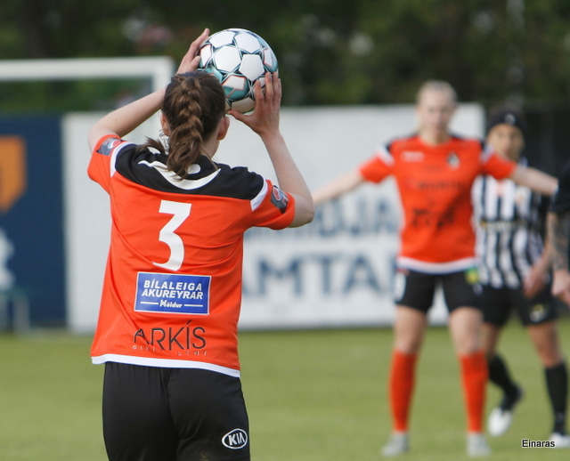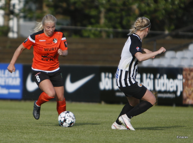 Thelma Lóa fer af stað upp kantinn. Hún kemst upp að marklínu en Íris Una nær að setja boltann í horn.